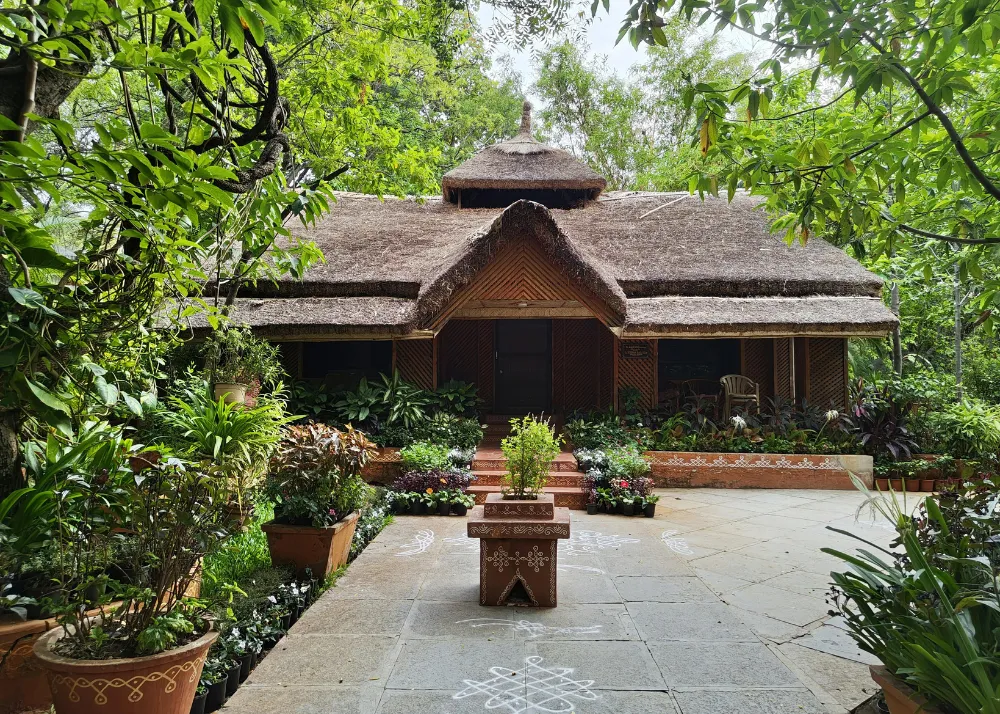 The main entrance of Bhuvanam Greens resonates with nature through an earthy material palette of stone, wood, and lush planting.