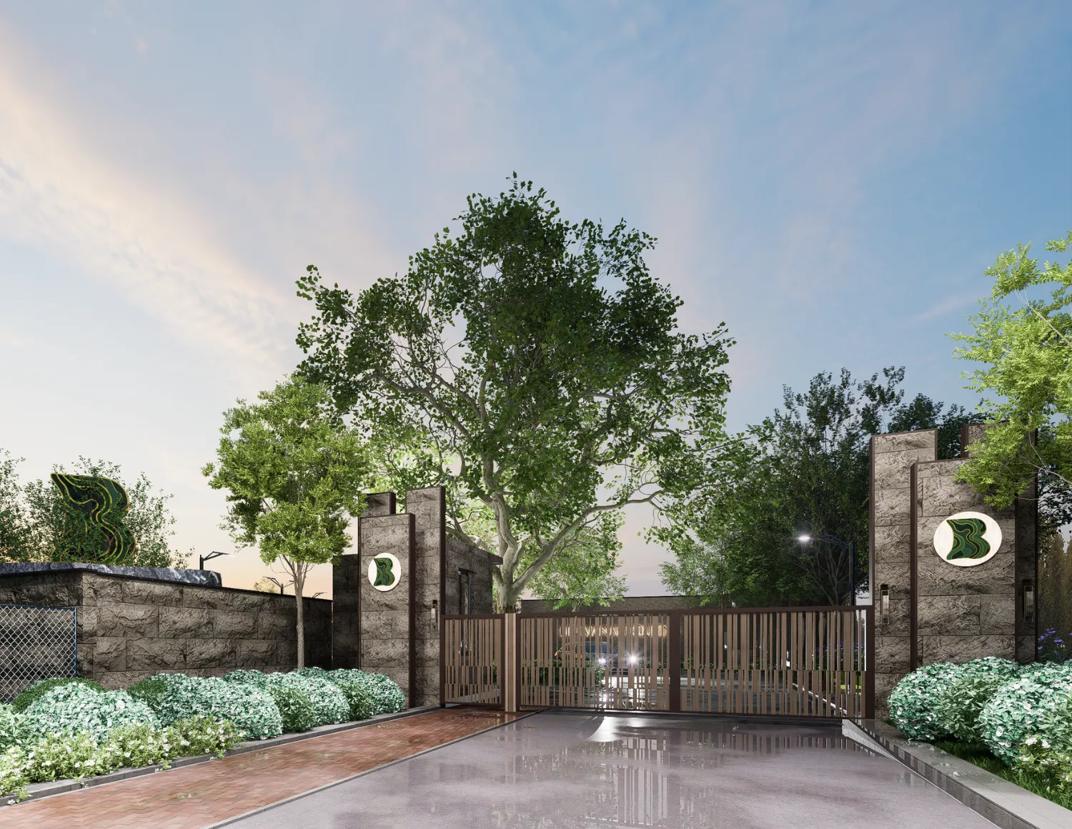 The entrance plaza exudes a sense of grandeur with the Bhuvanam Greens logo perched atop a rock formation inspired by the surrounding hills.