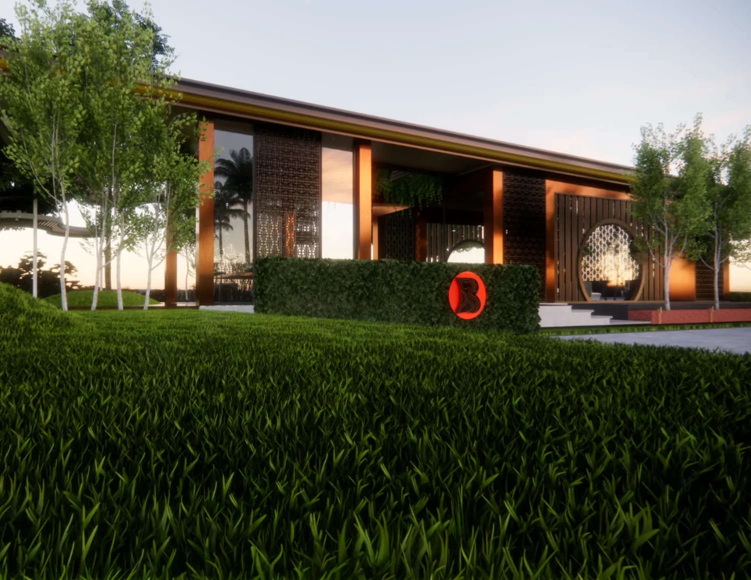 A pathway lined with native plants and flowers leads visitors towards a serene water feature, where soft lighting and rich textures create a sanctuary-like welcome.
